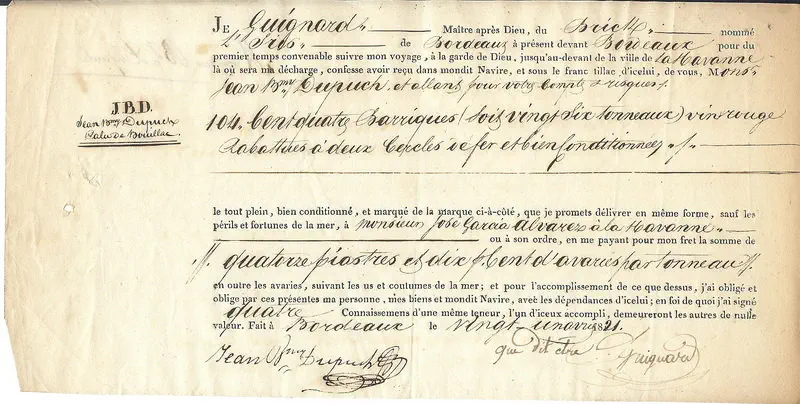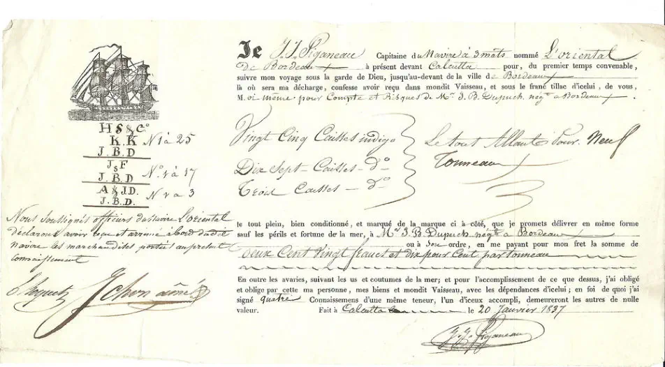 Connaissement émis à Calcutta pour Bordeaux le 20 janvier 1837