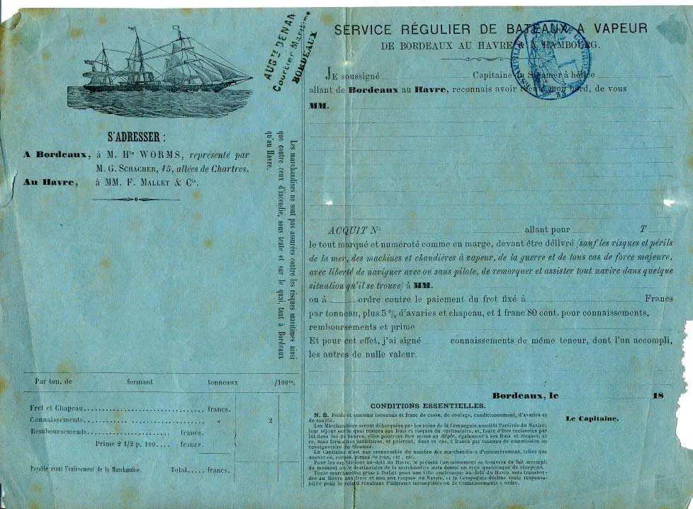 Connaissement de la maison Worms sur le ligne Le Havre-Bordeaux en 1873