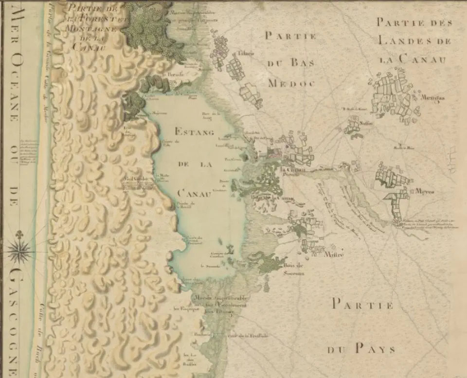 « Ce qu'il y a de plus remarquable en cette carte, c'est la forêt de Lacanau qui est presque toute de bois de pinada, où les habitants du pays ne