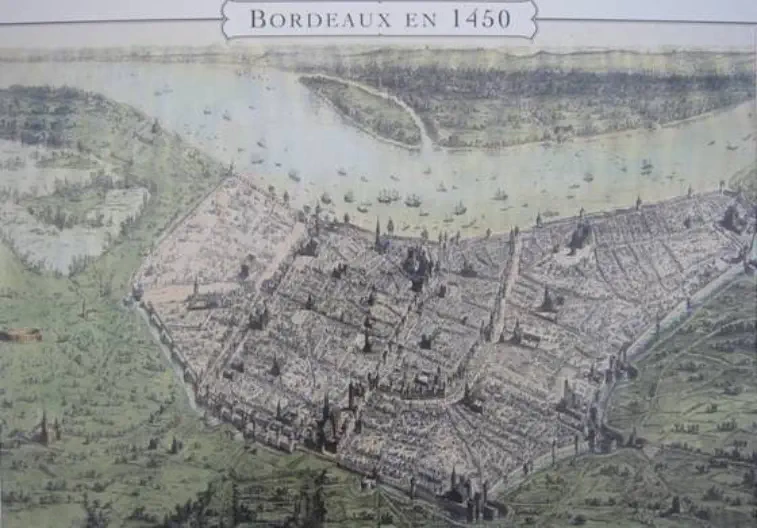 (Ph.-01)-Gravure montrant la ville de BORDEAUX en 1450.On aperçoit à gauche une zone humide.
