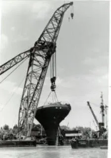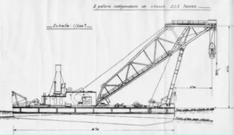 Le 14 avril 1987, la bigue flottante QUEYRIES prend en pendant sur son palonnier de 250 tonnes et son palan de 75 tonnes la grue Caillard 2,5/6