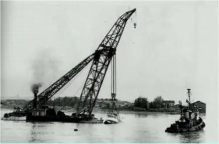 Un tronçon de navire coulé en 1945 relevé La bigue flottante FRANCOIS LEVEQUE remonte l’ESTIA. La FRANCOIS LEVEQUE assurant le