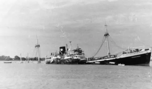 La FRANCOIS LEVEQUE avec l’arrière Le GHANAKUST avec des remorqueurs de l’URO en octobre 1958 L’arrière du GHANAKUST en pendant